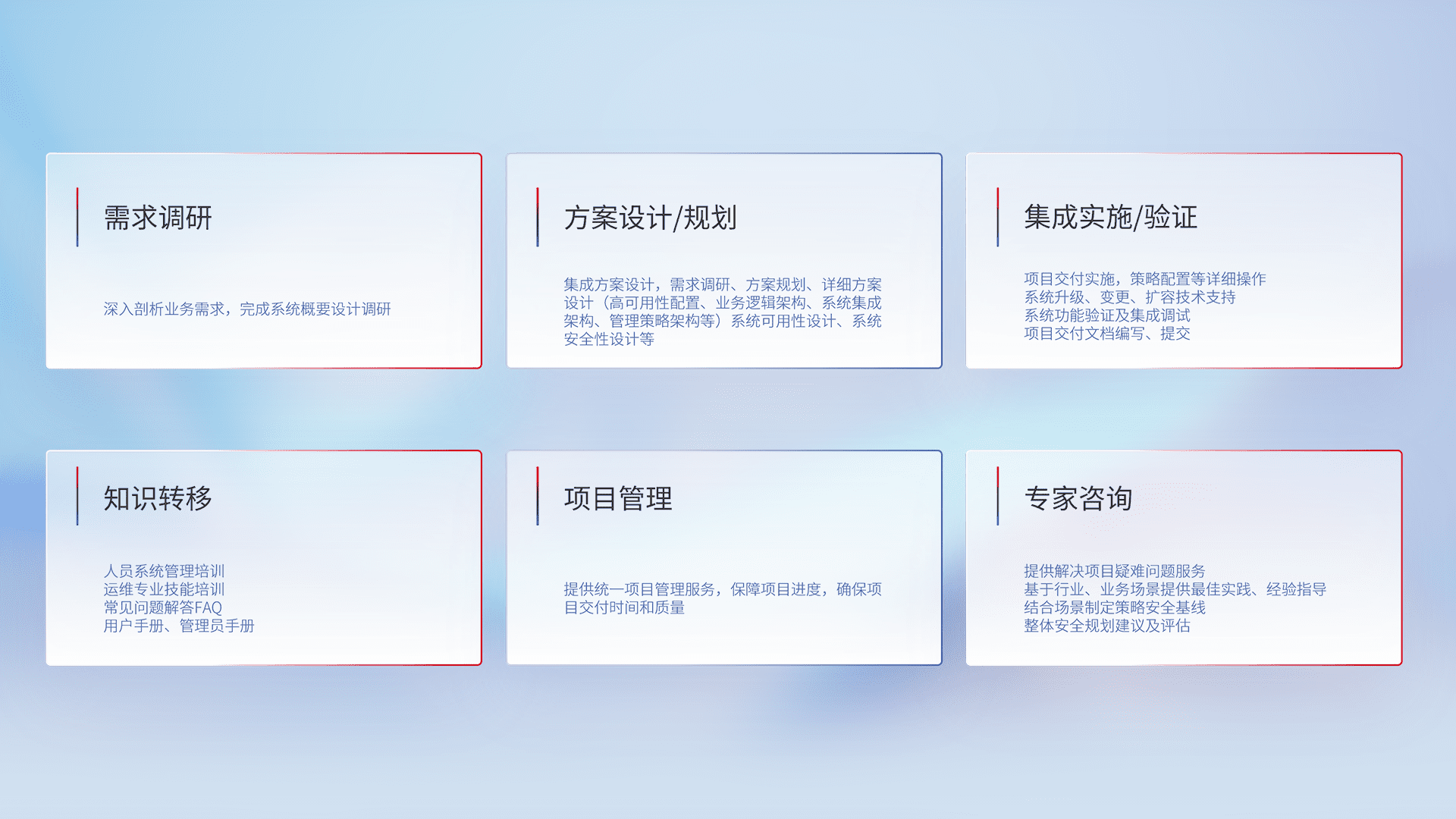 针对客户行业特性,,,将宏观的安全战略和需求,,通过专业的交付服务,,,,实现项目落地,,,为客户提供标准规范的集成交付服务。。。。
